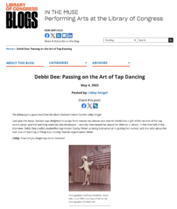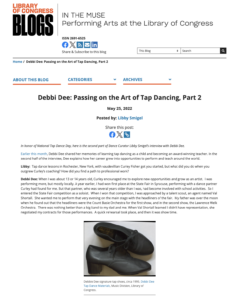 DEBBI DEE 2022 May Library of Congress Blog Part 1 2011 May/June Dance Studio Life Named a Living Treasure 2008 Dance News What's in a Name 2005 May Dance Teacher Debbi Dee Tap Intensive 1999 March Magazine Cover Dance Teacher 1989 Sept Sun Sentinel Tap Time Passion 2022 May Library of Congress Blog Part 2 2011 May Dance Teacher Debbi Dee...a Living Treasure 2008 May Dancer Magazine Contagious Passion of Debbi Dee 2005 Winter Magazine Cover On Tap 1999 March Dance Teacher Tap of Her Field by Debbi Dee On Tap Magazine Dr. Henry LeTang... 2018 Feb/March Inside Dance Mag Dancing's Standing Moments 2010 March Magazine of Florida A Passion for Pedagogy 2007 July Dancer Online Henry LeTang "My Teacher..." 1999 February Magazine Cover Dancer Magazine 1997 Winter Dance Spirit Born to Tap 2015 Jan/Feb Inside Dance Tapping into the Big Apple 2010 March Magazine Cover Dance Magazine of Florida 2005 May Dancer Tap...Talk...and Technique 1999 February Dancer Online Dance Teacher Extraordinaire 1995 Nov/Dec Tap Talk The Tap World of Debbi Dee